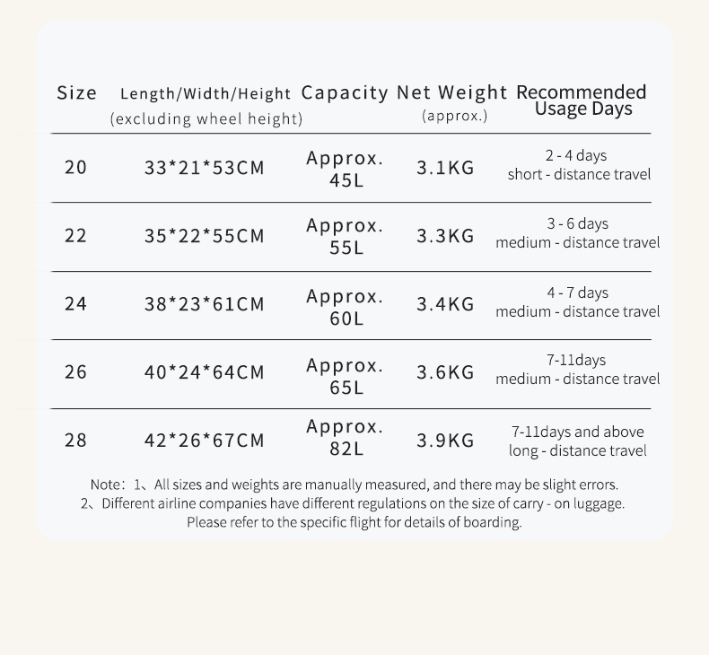 20 inches 34*23*54cm (can be boarded on the airplane cabin, suitable for travel within 5 days)